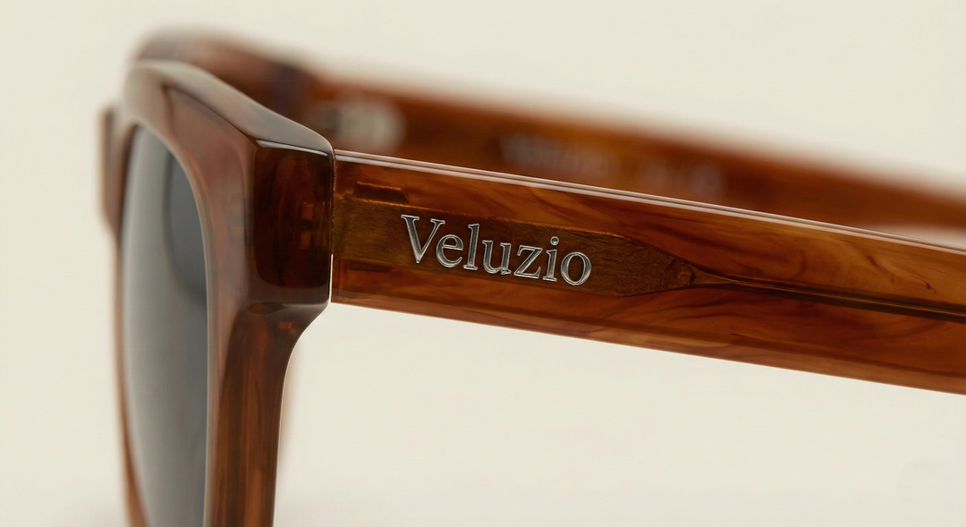 - Dettagli: Finiture di precisione con logo Veluzio inciso al laser sulla lente e sulle aste.